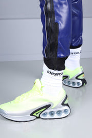 An athletic tapered fit is set off accent sections of Blue Vegan leather that run from hip to cuff creating movement, reflecting light and creating even more SHINE!!!