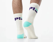 The ribbed leg, adorned with stripes and the P! logo, adds a touch of playfulness and contrasts with the toe and heel, while the cushy terry knit keeps you comfortable all day.