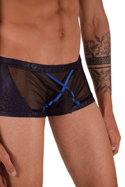 Designer Features: Gregg Homme logo crest centered on front waistband; mesh body with black and royal blue binding; textured black knit panels at sides